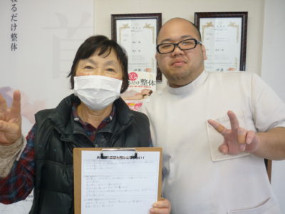 病院で何回も膝の水を抜いて痛み止めを打ったけど、全然膝痛が良くならなくて、水を抜いてもすぐに元に戻っていました。歩くと膝がすごく痛くて、階段を降りるのが大変で我慢できなかったので来院しました。